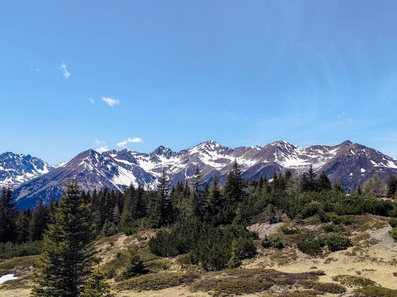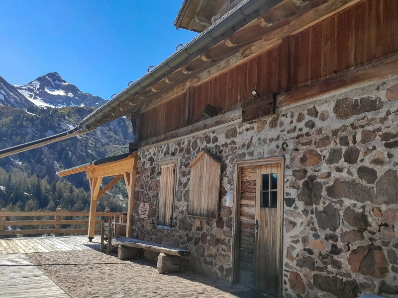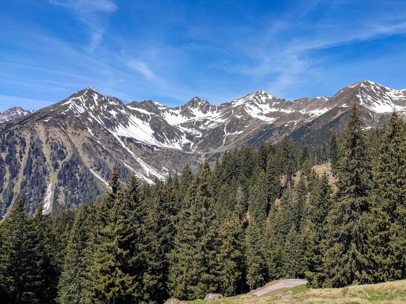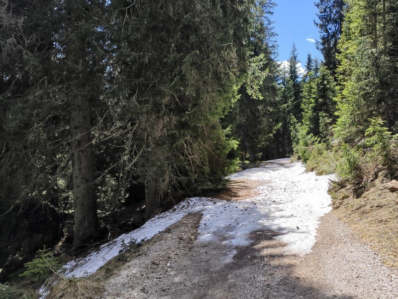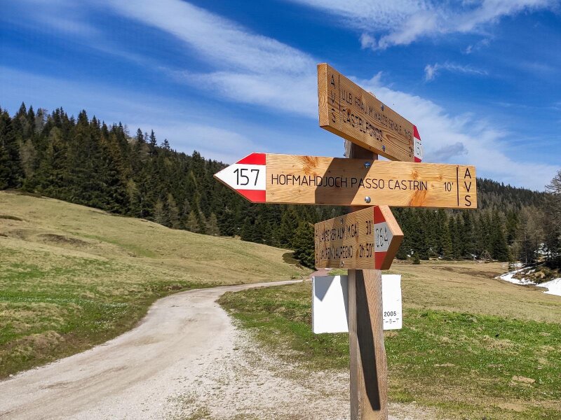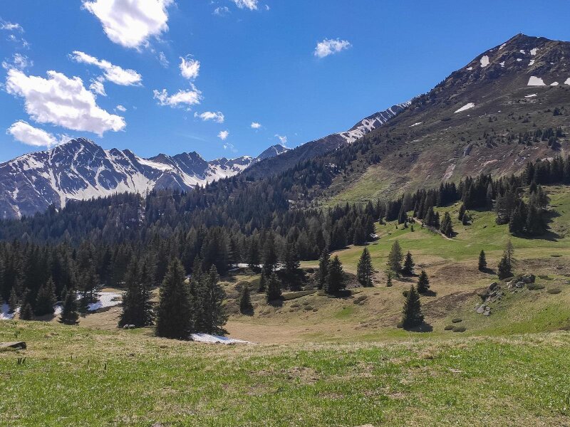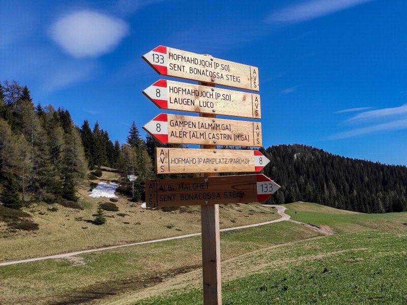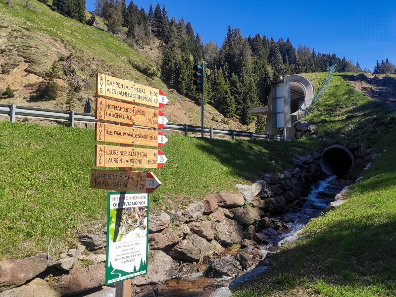 Wir lassen unser Auto am Parkplatz am Hofmahdjoch, das das Ultental in Südtirol mit dem Nonstal verbindet: Laurein und Proveis, die nächsten Dörfer, gehören noch zum Deutschnonsberg, vom Trentino aus ist das Hofmahdjoch von Fondo und Castelfondo erreichbar. Der Parkplatz auf 1.663 Meter Höhe befindet sich direkt beim Tunnel, ist also einfach zu finden. Wir sind uns bewusst, dass in dieser Höhenlage zu unserer Wanderzeit im Mai noch Schnee liegen kann und die Almhütten, die im Sommer wunderbar herzhafte Gerichte anbieten, noch geschlossen haben.