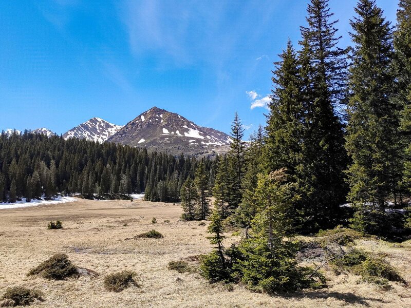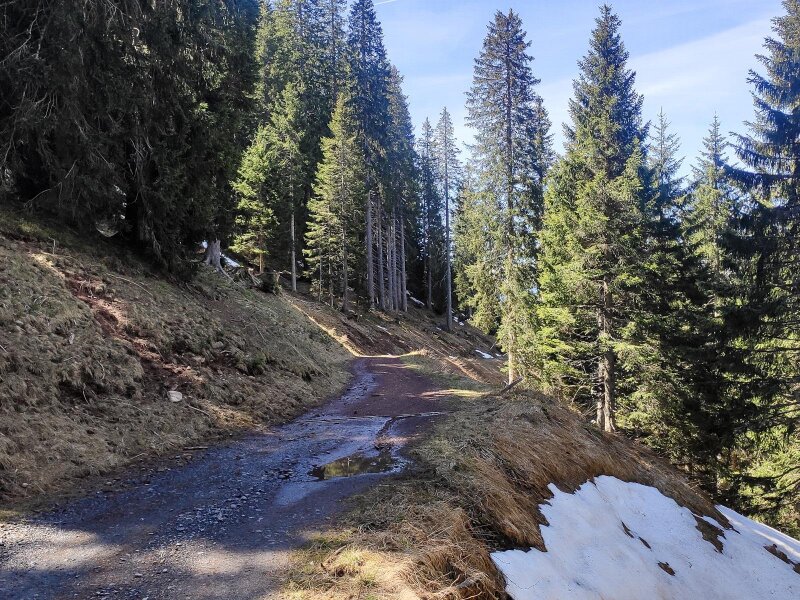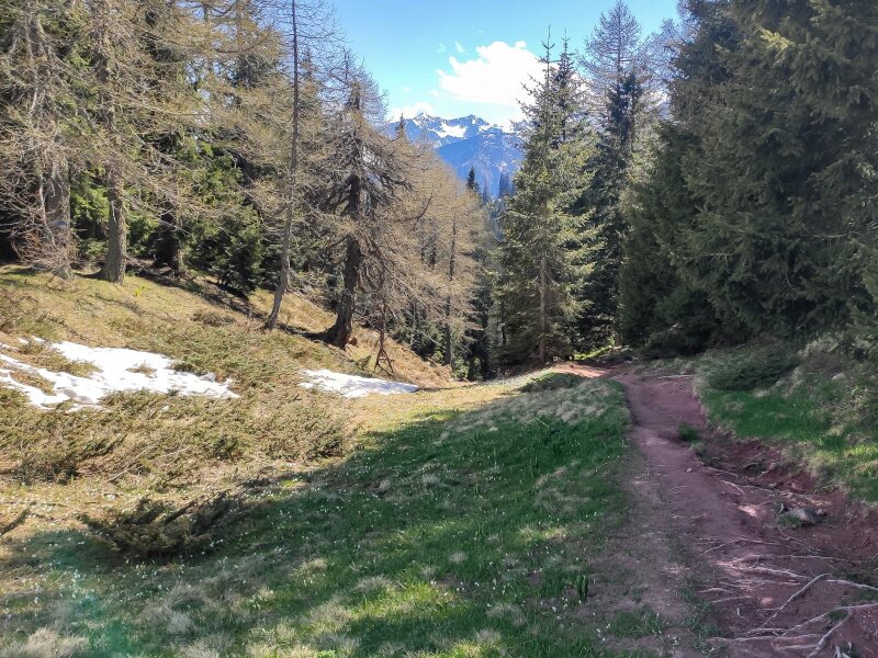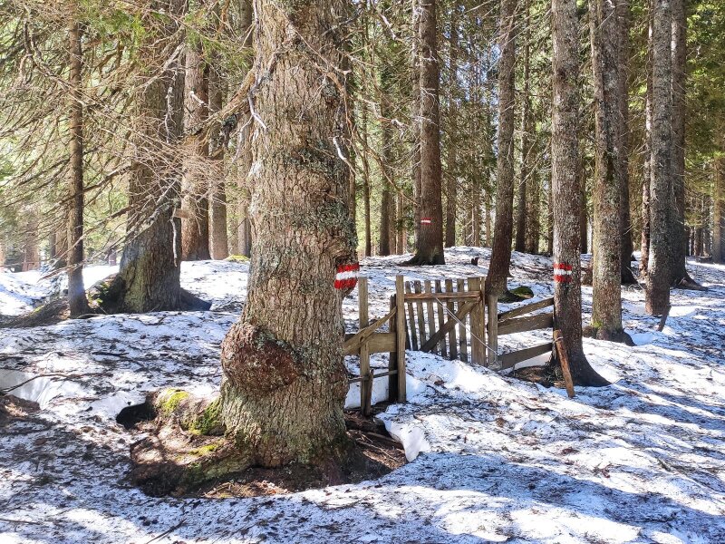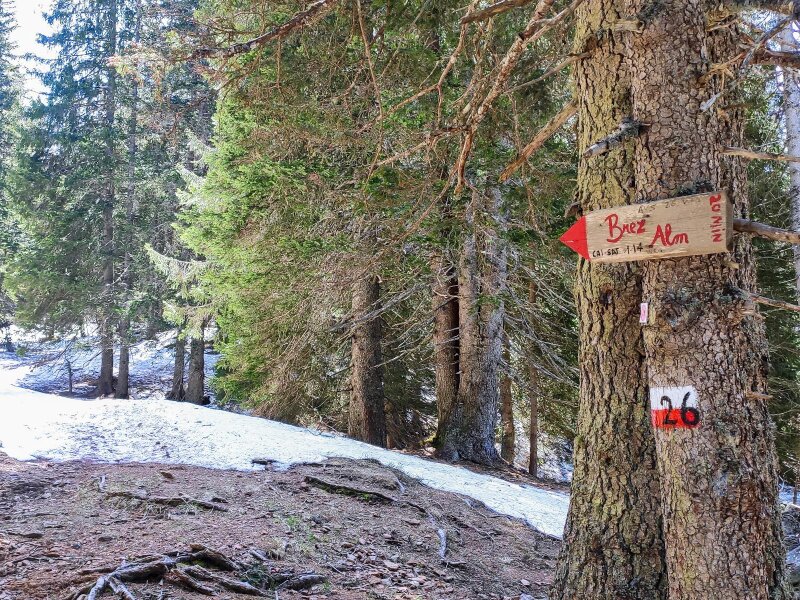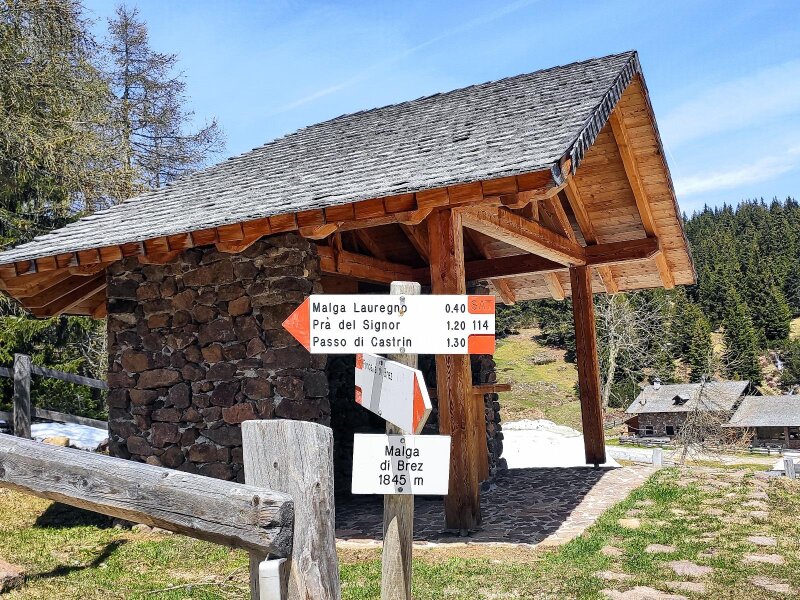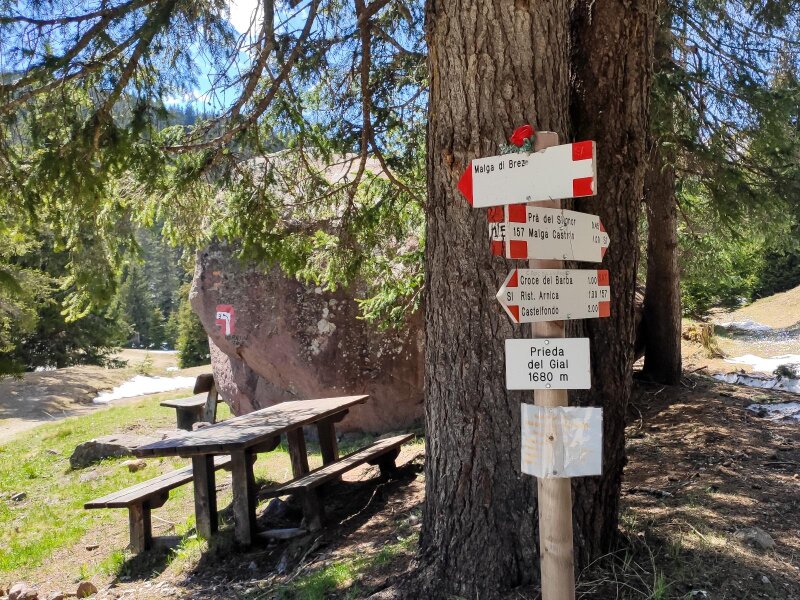 Von der Popi-Spitze geht es nun in den Wald hinunter Richtung Norden, wir suchen die Spuren am ausgetretenen Weg und kommen auf 1.680 Meter Höhe zur Prieda del Gial, einem Platz mit Tischen und Bänken. Von dort folgen wir den Wegweisern in Richtung Malga Castrin. Nach dem Monte Sous Moor mit einem Beschreibungsschild geht es auf einer Forststraße weiter zur Alm, bei der wir nach einer Stunde ankommen. Dort kehren wir um und folgen bei der Abzweigung den Schildern zum Parkplatz, den wir nach einer weiteren halben Stunde Gehzeit erreichen.