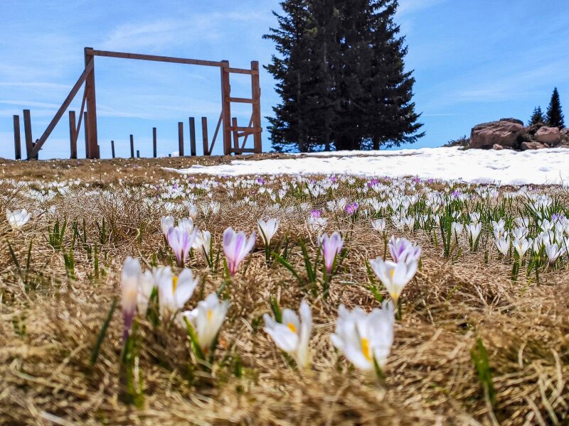 Die Almen sind alle nach Orten benannt: Brez und Laurein sind Dörfer, Castrin (Malga Castrin) ist der italienische Name für das Hofmahdjoch. Wir begegnen den ersten Schneefeldern und nach 20 Minuten erreichen wir den Weg Nr. 114. Einige Gehminuten weiter kommt eine weite Ebene in Sicht, die mit Krokussen bedeckt ist. Leicht abwärts geht es nun zur zweiten Almhütte, der Malga di Brez. Wir gönnen uns eine Pause und wandern rechts weiter, dem Schild "Stuanmandl Popi" nach. Leicht aufwärts erreichen wir in rund 20 Minuten eine Anhöhe mit herrlichem 360°-Blick auf die Dolomiten, die Brentadolomiten und die Gipfel des Ilmenkamms (Maddalene-Gruppe).