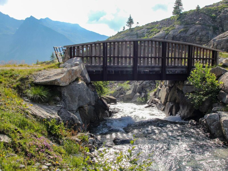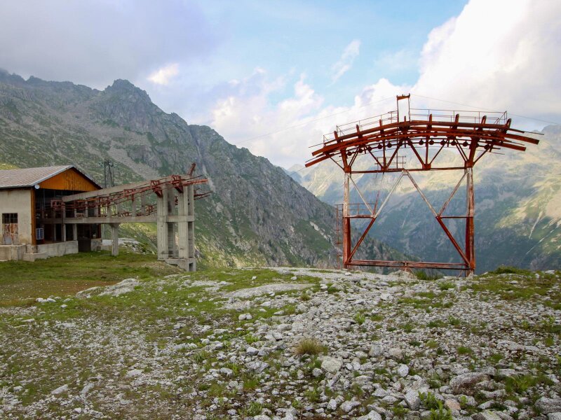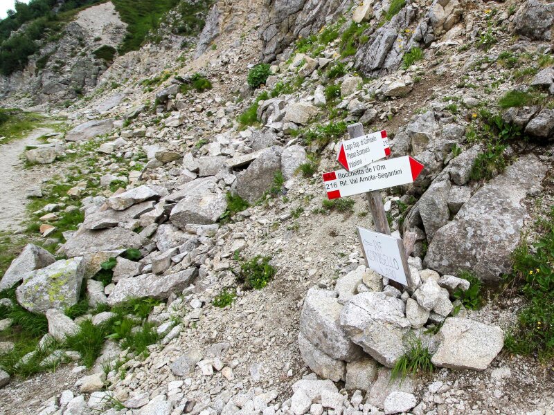 Nach einer Pause wandern wir zurück, bis wir wieder die Abzweigung zum Lago di Vedretta erreichen. Rechts wählen wir den Weg Nr. 216, der uns zum Lago Nero (Schwarzer See) führt: Im Hintergrund thronen die Brentadolomiten. Den rot-weißen Markierungen nach geht es nun zum Rifugio Cornisello und dann zum Parkplatz zurück. In der Nähe der Almhütte - übrigens die einzige Einkehrmöglichkeit - treffen wir auf die Überreste einer Güterseilbahn und einiger Hütten. Es sind die Reste eines Projektes zur Nutzung der Wasserkraft im Tal, das dann aber nicht realisiert wurde.