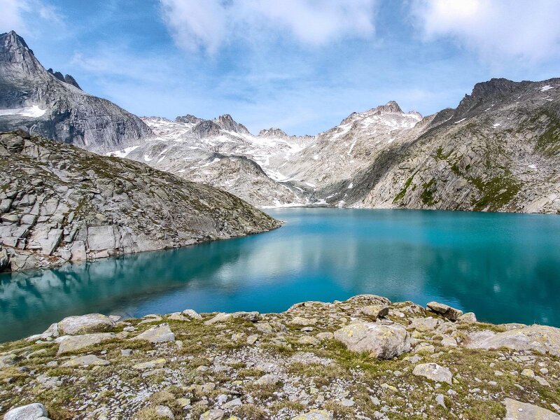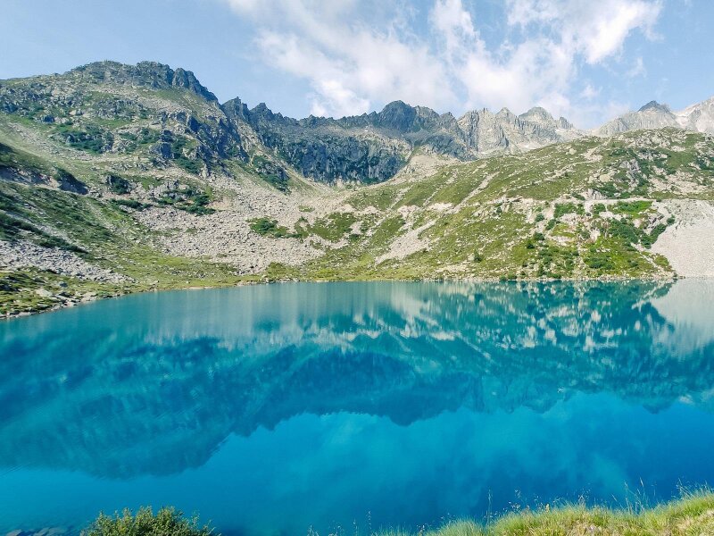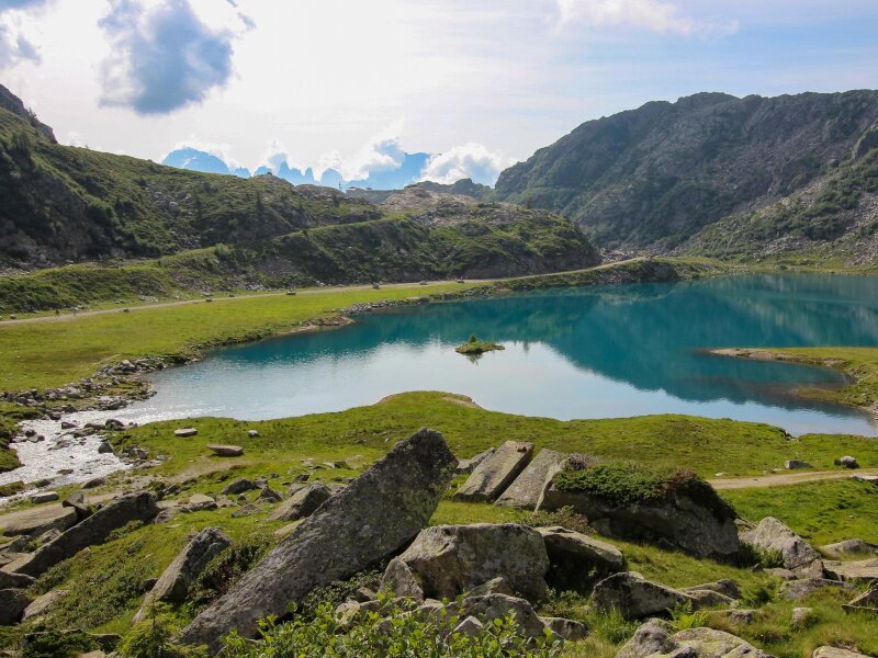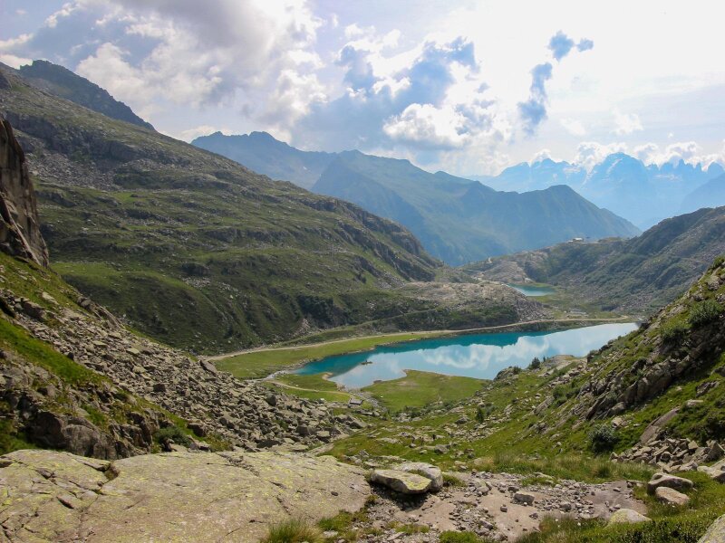 Bei einem kleinen Sattel kommen wir wieder zu Atem und sehen unter uns die Laghi di Cornisello, die wir soeben hinter uns gelassen haben, zudem den Lago Nero, den wir noch erreichen wollen, und die Brentadolomiten auf der anderen Talseite. Nun geht es weiter aufwärts bis zum Lago Vedretta in der spektakulären Natur des Naturparks Adamello Brenta. Der glasklare Bergsee ist überraschend groß und liegt auf 2.628 Meter Höhe. Es ist der höchste Punkt unserer Wanderung.