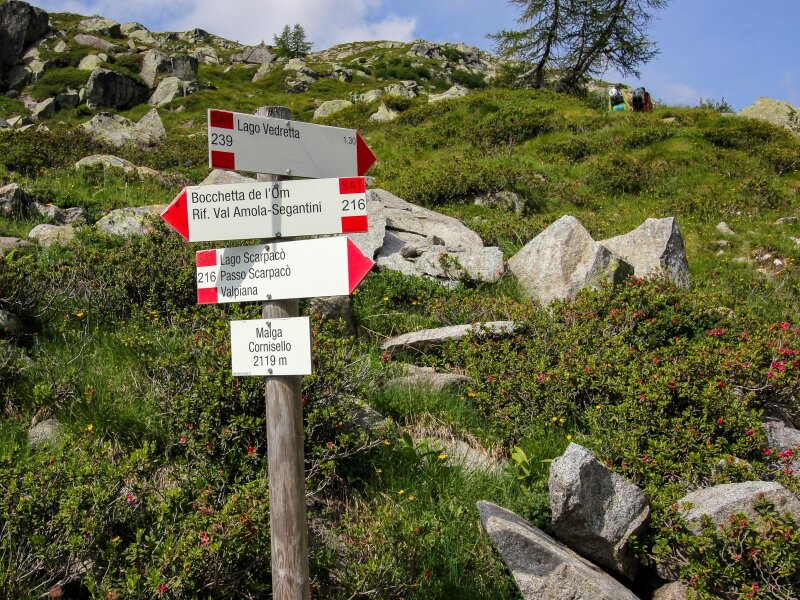 Dort beginnt bereits die Forstsstraße, gekennzeichnet mit der Nummer 319, der wir bis zum Lago di Cornisello Inferiore folgen. Der See ist in 10 Minuten erreicht, gleich danach kommt auch der etwas größere Lago di Cornisello Superiore in Sicht (inferiore bedeutet unterer, superiore oberer, also der Obere Cornisello See). Wir wandern weiter bis zur Abzweigung zum Lago di Vedretta (Nr. 239). Zuerst bringt uns der Weg leicht ansteigend bergauf, danach wird es steiler.