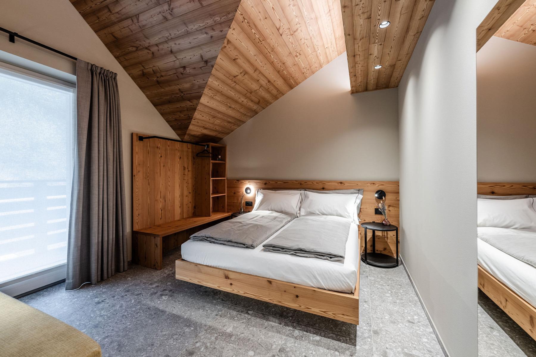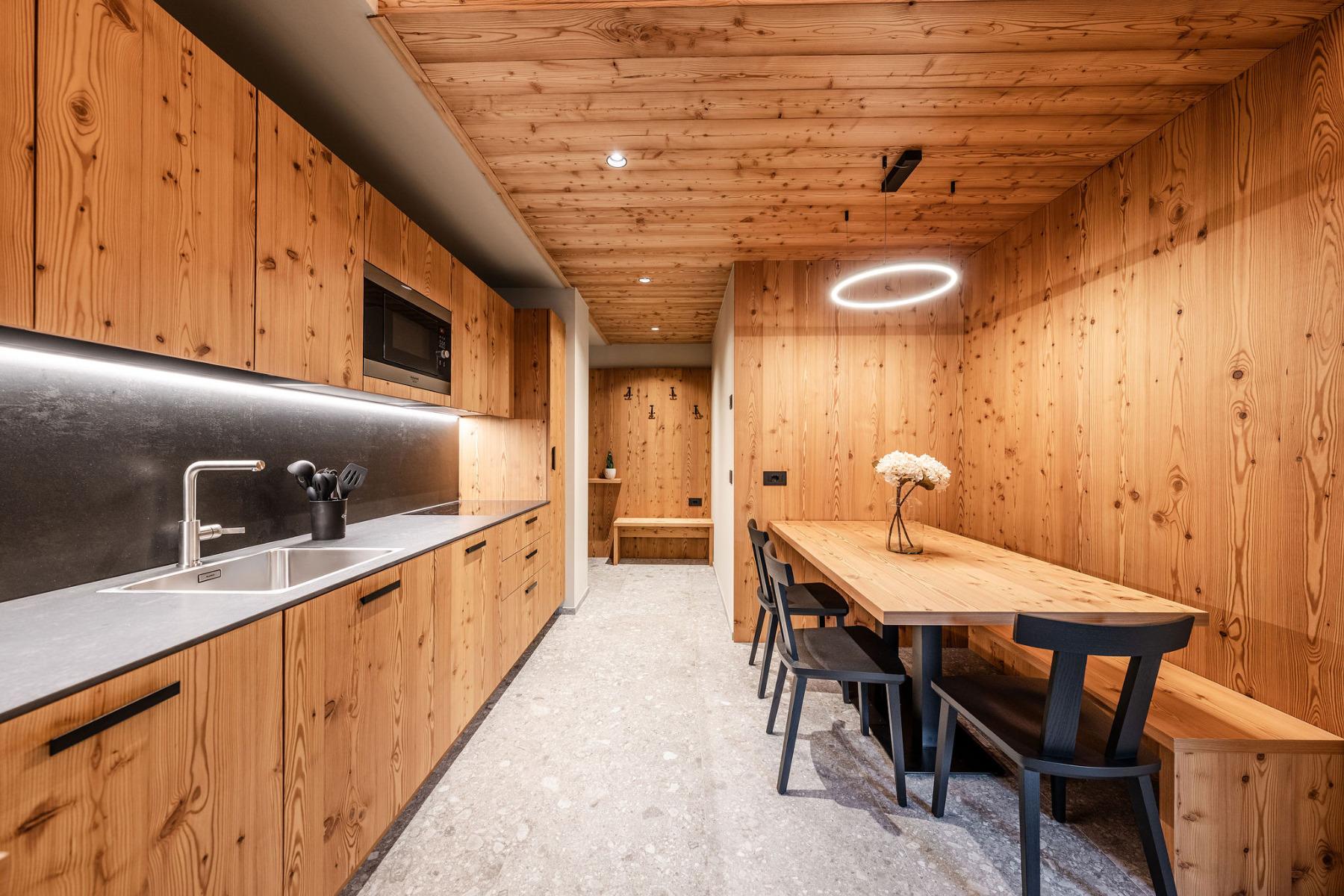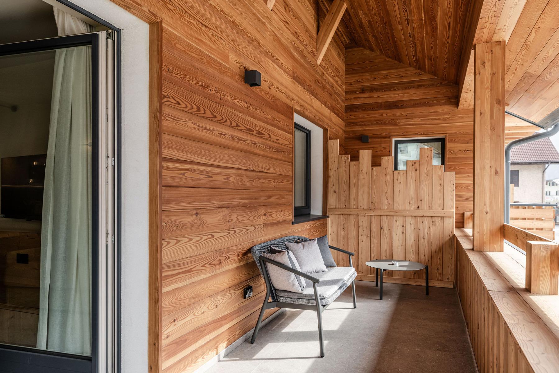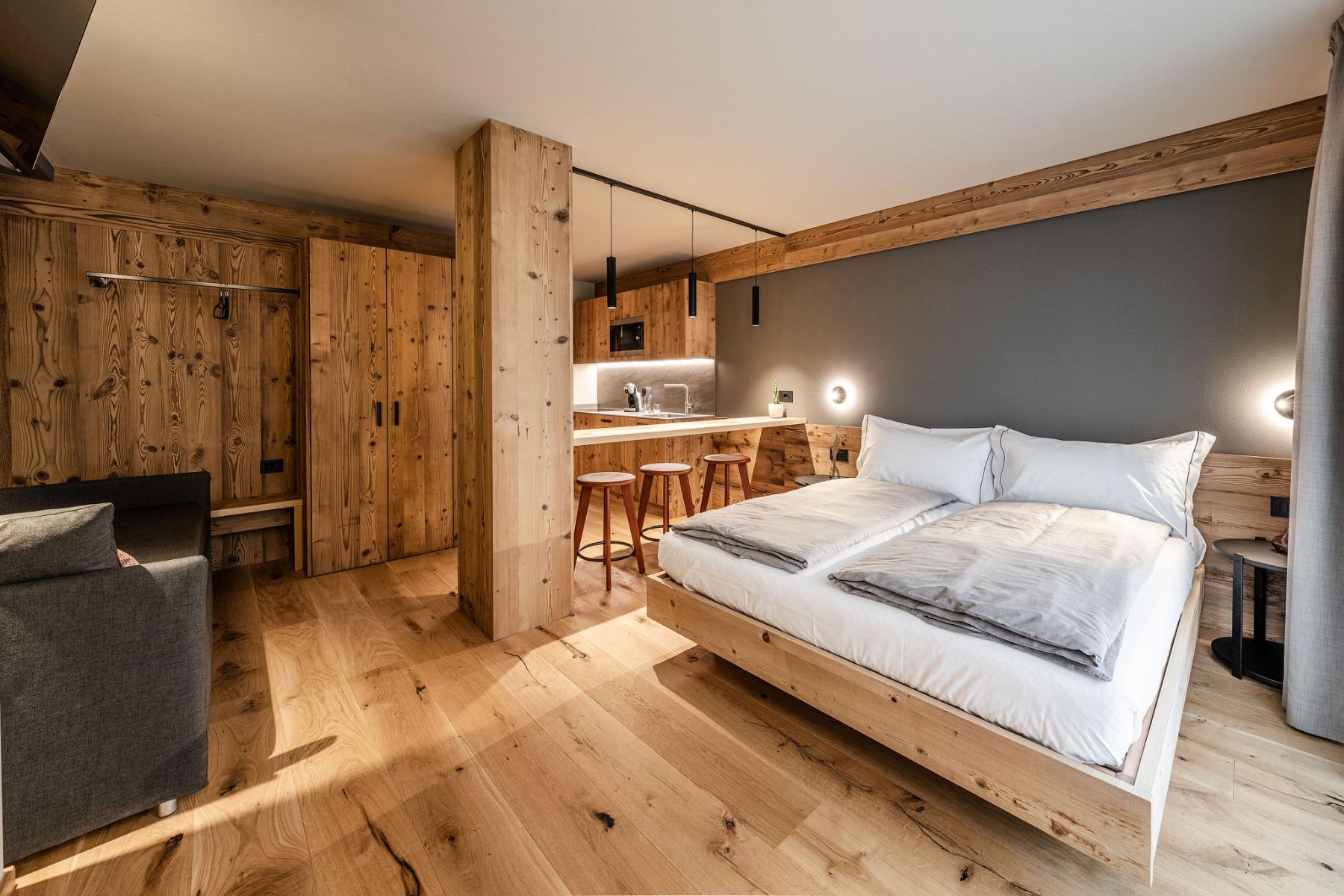 Die 12 modernen Apartments wurden mit Lärchen- und Fichtenholz eingerichtet.