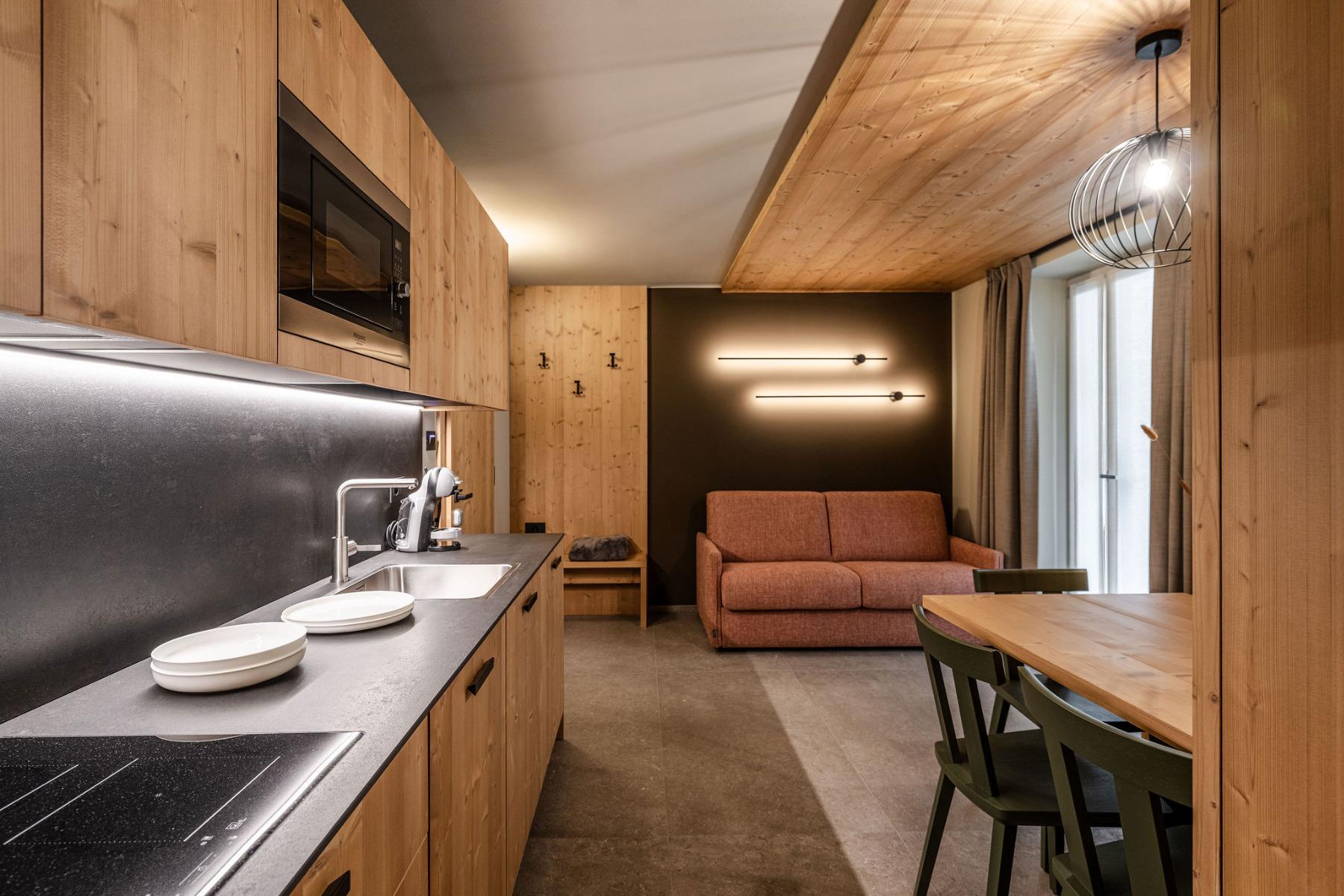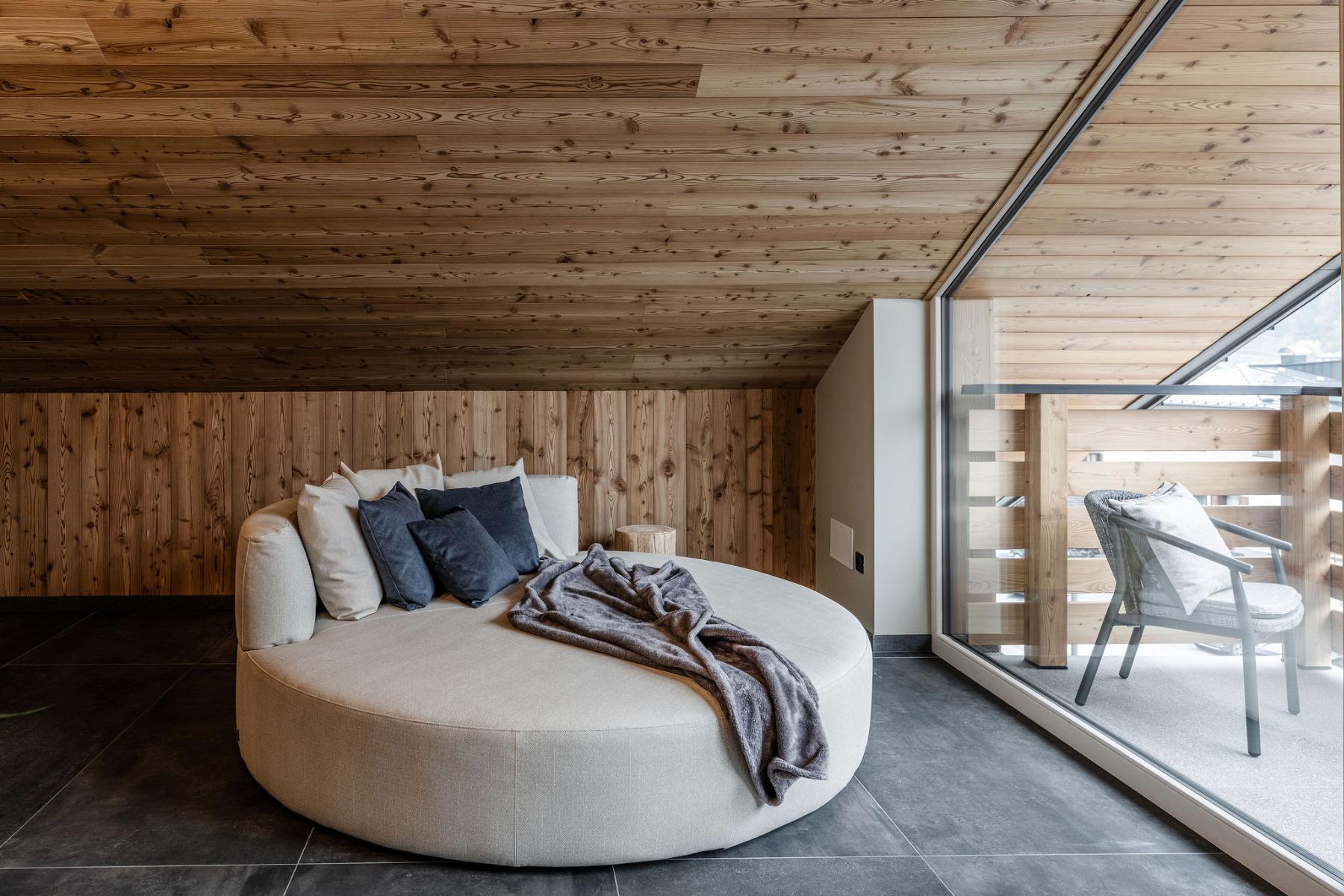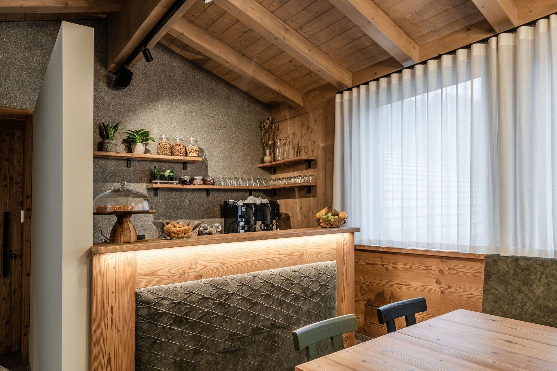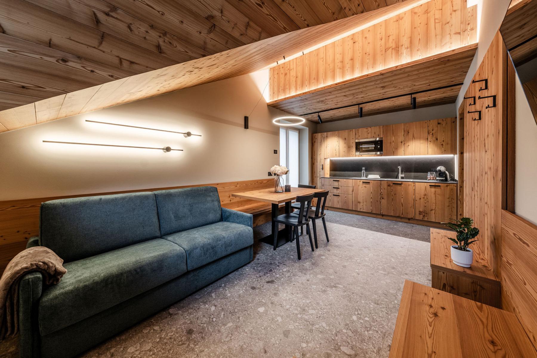 Die 12 modernen Apartments wurden mit Lärchen- und Fichtenholz eingerichtet.