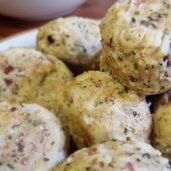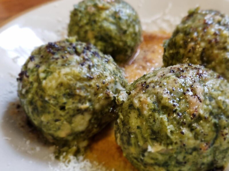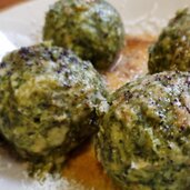 The dough of dumplings is made of stale bread, milk, eggs and usually flavoured with speck, ham, spinach, cheese, parsley, chives, mushrooms, beetroot and more. With the obtained dough you can form balls with a diameter of 7-8 cm which are then cooked in boiling salt water. Dumplings can be served with or without broth and seasoned with melted butter, chives and a sprinkle of Parmesan cheese.