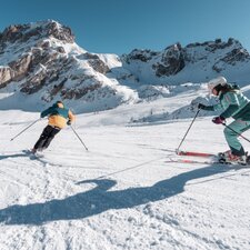 Take the ski lift from Alba di Canazei to the ski area Alba Ciampac which is directly connected to the Pozza-Buffaure ski area