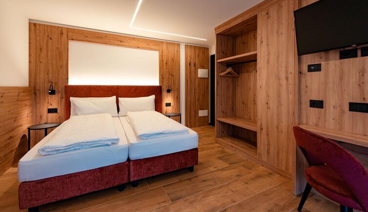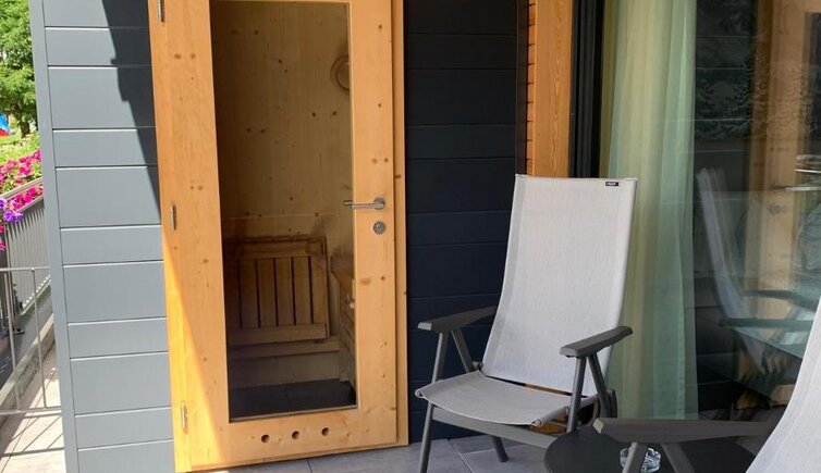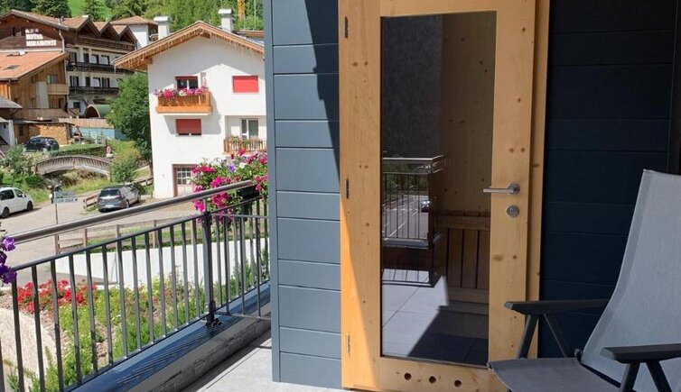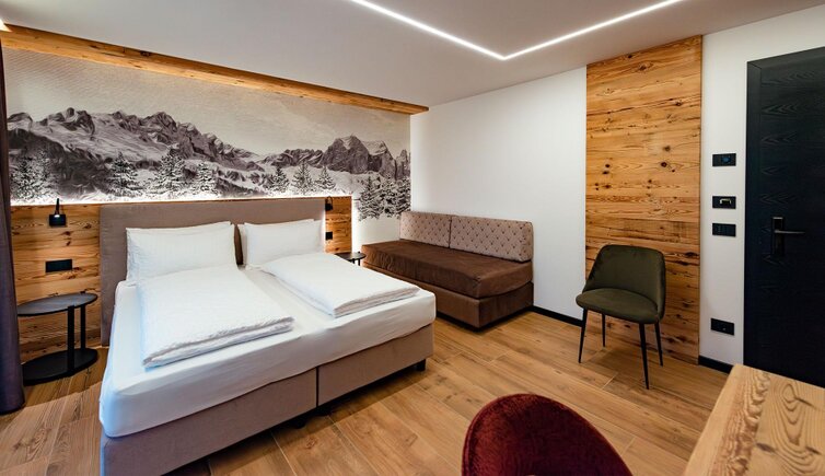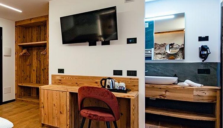 The bright and spacious rooms are furnished in an elegant, alpine style with natural wooden elements. You can enjoy a marvellous view on either the Cima XII, the Catinaccio or the Croda Rossa. The suite also features a private sauna.