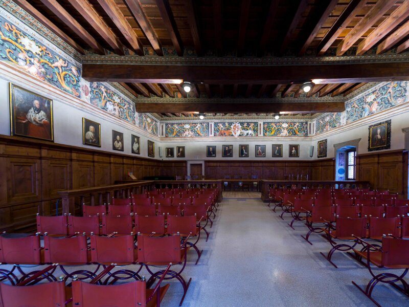 Il tuo viaggio alla scoperta degli ambienti più importanti del palazzo inizia dalla Sala dell'Attesa, il punto di accesso alle stanze nobili dell'appartamento vicario. Riservata alle persone che aspettavano di essere ricevute dal funzionario vescovile, la Sala dell'Attesa elegantemente decorata è completa di una scala a chiocciola in legno di cirmolo che permette di accedere alla Sala delle udienze e al secondo piano. Poi ti addentrerai nel regno di Morfeo. Allestita nel 1539, la stanza da letto del vicario vescovile è l'unica del palazzo ad aver conservato il suo rivestimento ligneo originale. Il legno fu il materiale prediletto per le stanze da letto poiché, grazie alle sue capacità di assorbimento dell'umidità, donava calore a tutto l'ambiente. Dalla tranquillità si passa ora al Salone Clesiano, noto anche come Sala delle Udienze, dove l'atmosfera era decisamente più accesa e agitata. Infatti, in questo antico tribunale, il giudice del principe vescovo veniva affiancato nel suo lavoro dal Consiglio dei Giurati di Fiemme.