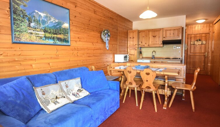 Il confortevole appartamento, arredato con molto legno, offre comodamente fino a 7 posti letto. Esso è composto da 2 camere da letto, un bagno, un soggiorno con sala da pranzo, angolo cottura e terrazza.